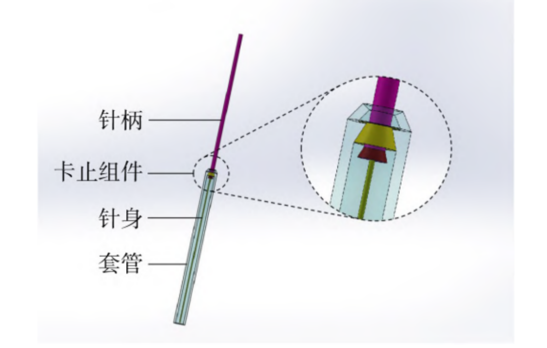 “无忧针灸”是一款一次性使用自毁式无菌套管针灸针,由针体、套管和卡止组件三部分构成。其核心设计在于: