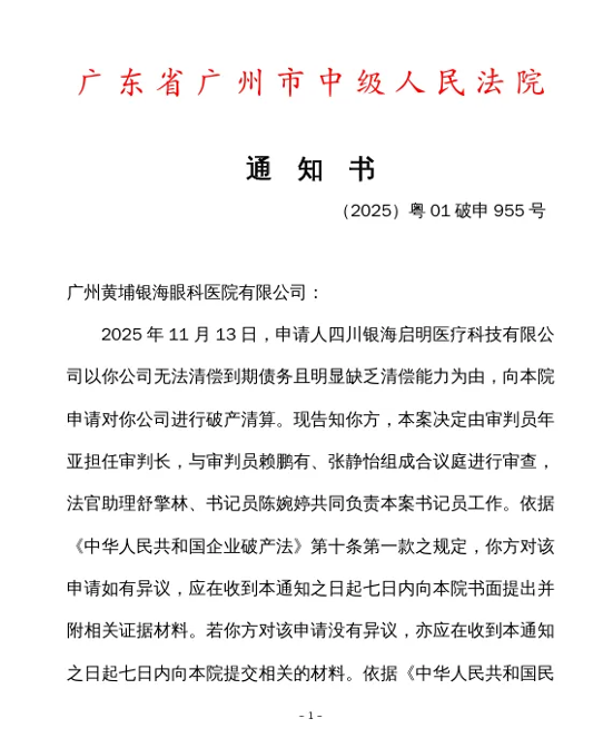 通告原文显示,2025 1113日,申请人四川银海启明医疗科技有限公司以广州黄埔银海眼科医院有限公司无法清偿到期债务且明显缺乏清偿能力为由,向法院申请对广州黄埔银海眼科医院有限公司进行破产清算。