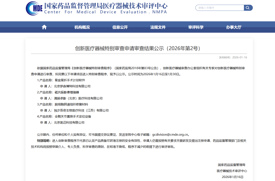 依据国家药品监督管理局《创新医疗器械特别审查程序》(国家药监局2018年第83号公告),创新医疗器械审查办公室组织有关专家对创新医疗器械特别审查申请进行审查,拟同意以下申请项目进入特别审查程序,现予以公示。公示时间为2026年1月16日至1月30日。