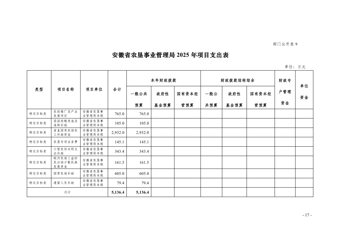 安徽省农垦事业管理局2025年度项目支出绩效目标