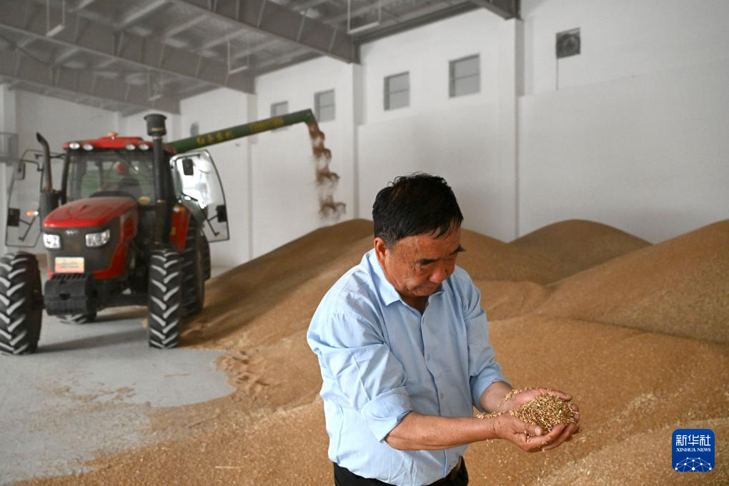 5月28日,徐淙祥在太和县淙祥农事服务中心察看收获的小麦。