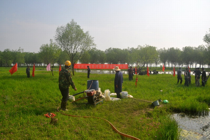 安徽皖河农场2014年顺利通过了省市两级血防控制传染源达标验收,4月1日再掀今春灭螺“大会战”,巩固血防达标成果,有效防控血吸虫疫情和发病率,有力保障疫区职工群众的身心健康。 灭螺现场人头攒动、机器轰鸣、会战犹酣。参战人员严格按规范程序操作,先上游、后下游,在江滩河滩湖摊草场普遍喷洒灭螺药物,将各环节措施落实到位,细致均匀、不留死角,做到灭一块、清一块、成一块,力争实现全场有螺区域春季灭螺“全覆盖”。 农场80多人参加了此次会战,投入专用机器8台套,每天灭螺约50万平米,整场会战将持续4天。安庆市血防所领导到场指导,并调集海口、十里、前进、花山4个专业血防机构人员前来助阵。(徐丽燕 黄法严)