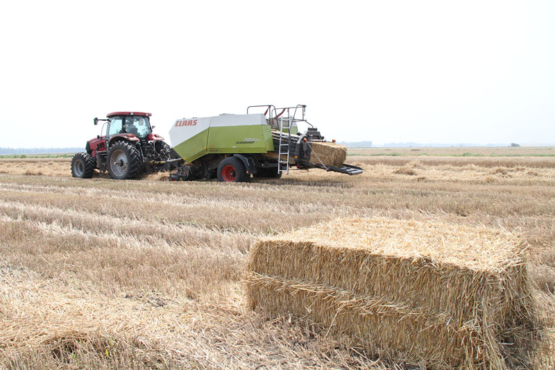 龙亢农场还从黑龙江农垦调运来4台(套)CLAAS(克拉斯)QUADRANT打捆机,用于对小麦秸秆打捆再利用,具有打结紧固和工作快速、精确、可靠等特点,同时两片风扇吹走打结器工作时的作物茎秆、谷壳和尘土,保证了秸秆打捆质量。(李峰 高磊磊)